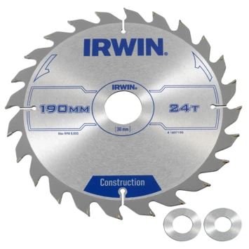 Irwin cirkelzaagblad nr. 1897199 is een zaagblad met een diameter van 190mm en een asgat van 30mm. Er worden 2 reductieringen meegeleverd, waarmee je het asgat kan aanpassen naar 20 en 16mm. Door de grove vertanding (24T) zaag je snel door houten platen, maar is de afwerking wat ruw. Het blad heeft een dunne zaagsnede met wisselende EVO tanden om nog sneller te kunnen zagen. De hardmetalen carbide punten van industriële kwaliteit blijven langer scherp en gaan langer mee.