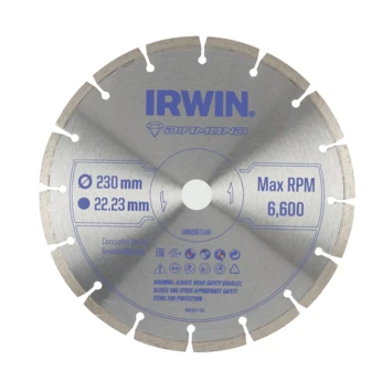 Irwin Pro Performance diamantzaagblad IW8087106 past op alle gangbare 230mm haakse slijpers. Het zaagblad heeft een gesegmenteerde rand en is geschikt voor het doorslijpen van steen. Diameter diamantblad: 230mm.