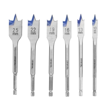 Irwin Blue Groove speedborenset 10502826 is 6-delige set met platte houtboren geschikt voor het boren van gaten met een grote diameter in hout, laminaat en spaanplaat. De set bestaat uit 6 houtboren met diameter 10, 13, 16, 19, 22 en 25mm.
