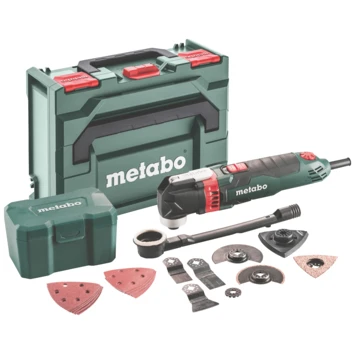 “De Metabo multitool MT 400 Quick is onmisbaar bij de interieurbouw voor het zagen, schuren, schrapen en raspen van de meest uiteenlopende materialen. Aansluiting van gereedschap is voor maximale uitwisselbaarheid met OIS-, Starlock- en andere toebehoren. Met Metabo Quick gereedschapsnelwissel voor tijdbesparend, comfortabel wisselen van toebehoren Snel en krachtig door de combinatie van grote oscillatiehoek van 3,2° en VTC-elektronica met constant toerental, ook onder belasting. Extra heldere dubbele LED voor goed zicht op het werkgebied. Slank design en antislip softgrip-oppervlak voor optimale bediening. Afzuigmogelijkheid door aansluiting van een alleszuiger. Wordt geleverd met diverse toebehoren. In stevige kunststof koffer”